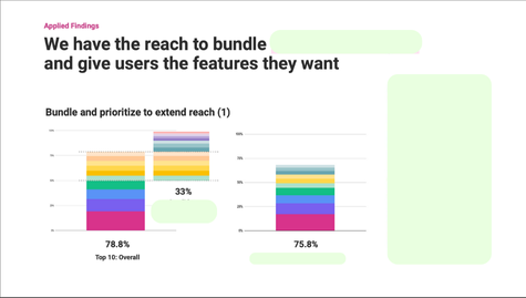 As an addendum, the findings were applied back to work already in progress across multiple teams. Rather than redirecting efforts, this step used the organized results as a common reference point helping teams see how their existing initiatives related to the same underlying value signals. This created a shared language for discussing tradeoffs, reduced fragmentation across parallel efforts, and allowed teams to connect their work to one another through evidence rather than alignment exercises.